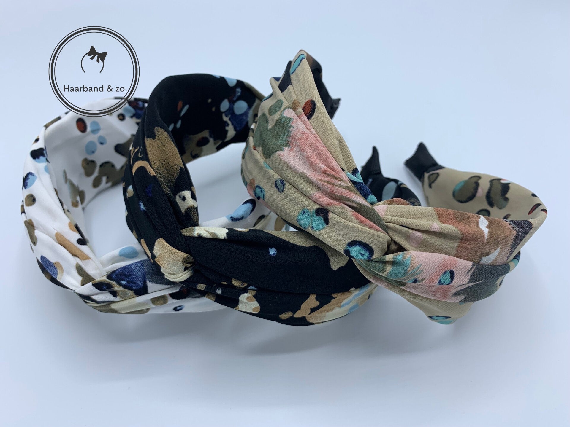 - Prachtige brede satijnen haarband met twist in frisse print, met wit als ondergrondkleur.
