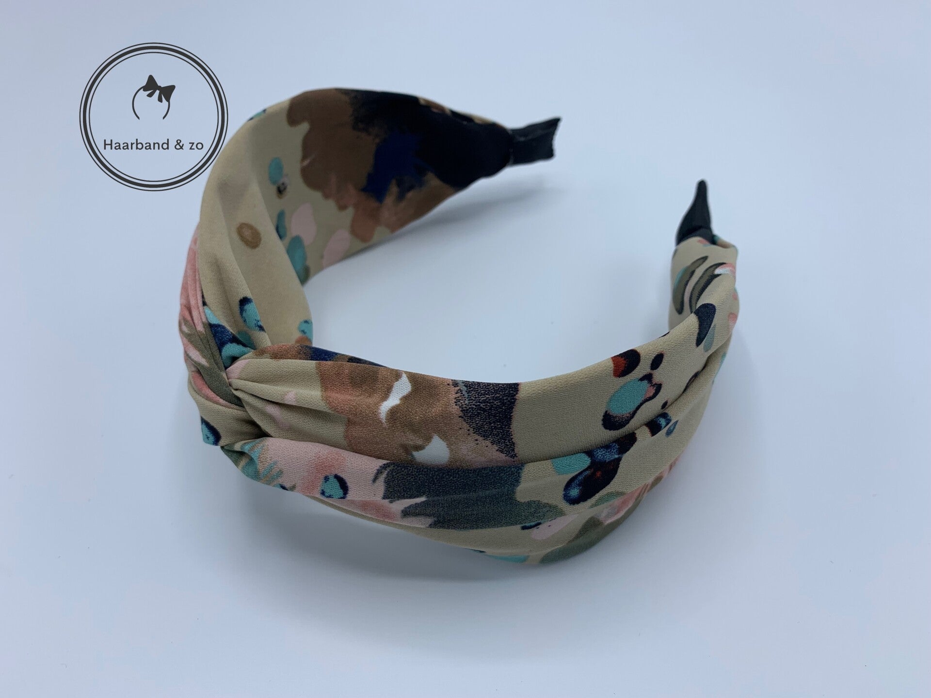 Brede booghaarband met twist in print met khaki ondergrond (art.nr. 149-03)