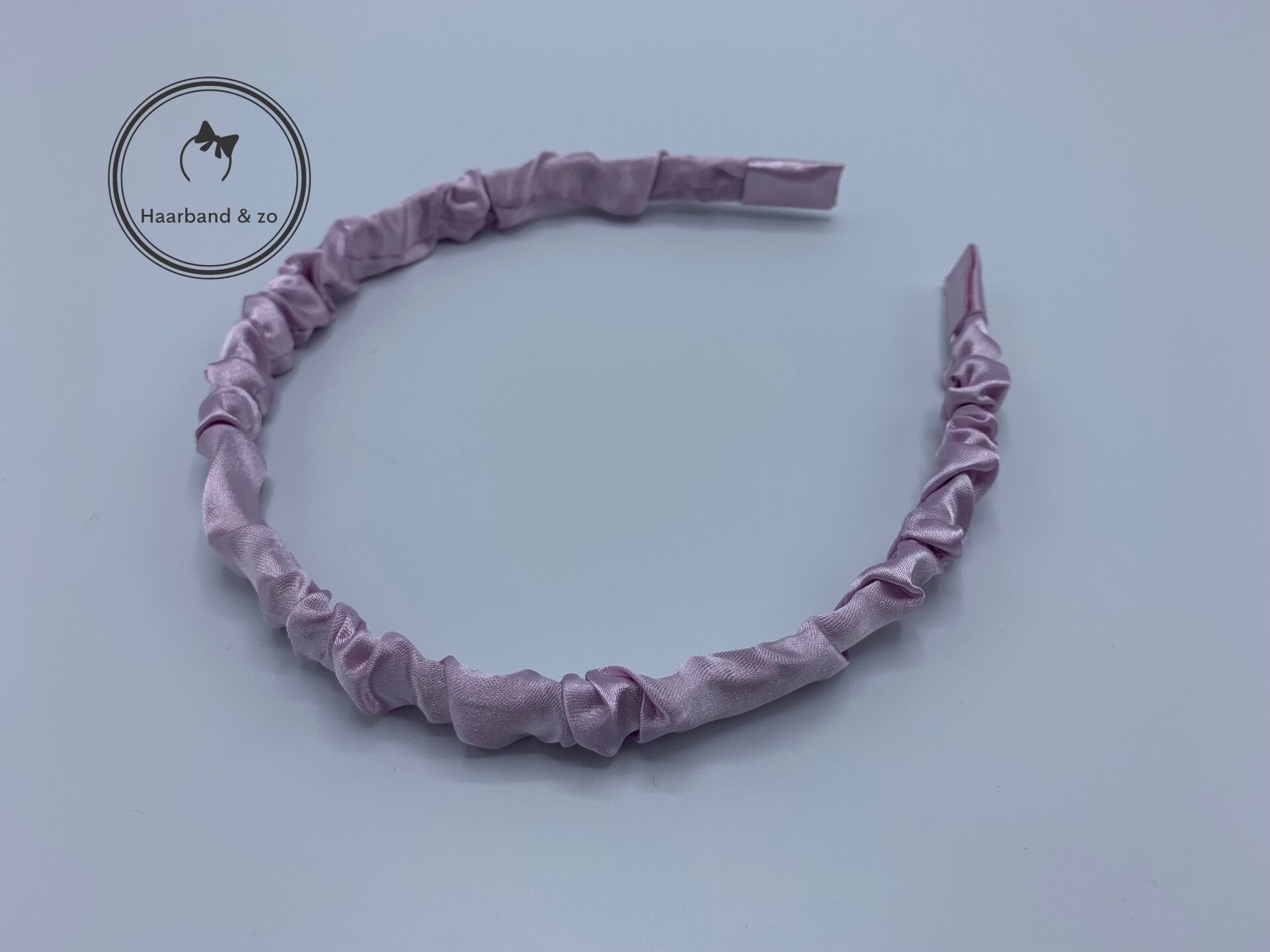 - Smalle haarband met ruches van glanzend satijn, in een lichte kleur lila. De ruches zitten los om het bandje waardoor je ze zelf kunt schuiven.