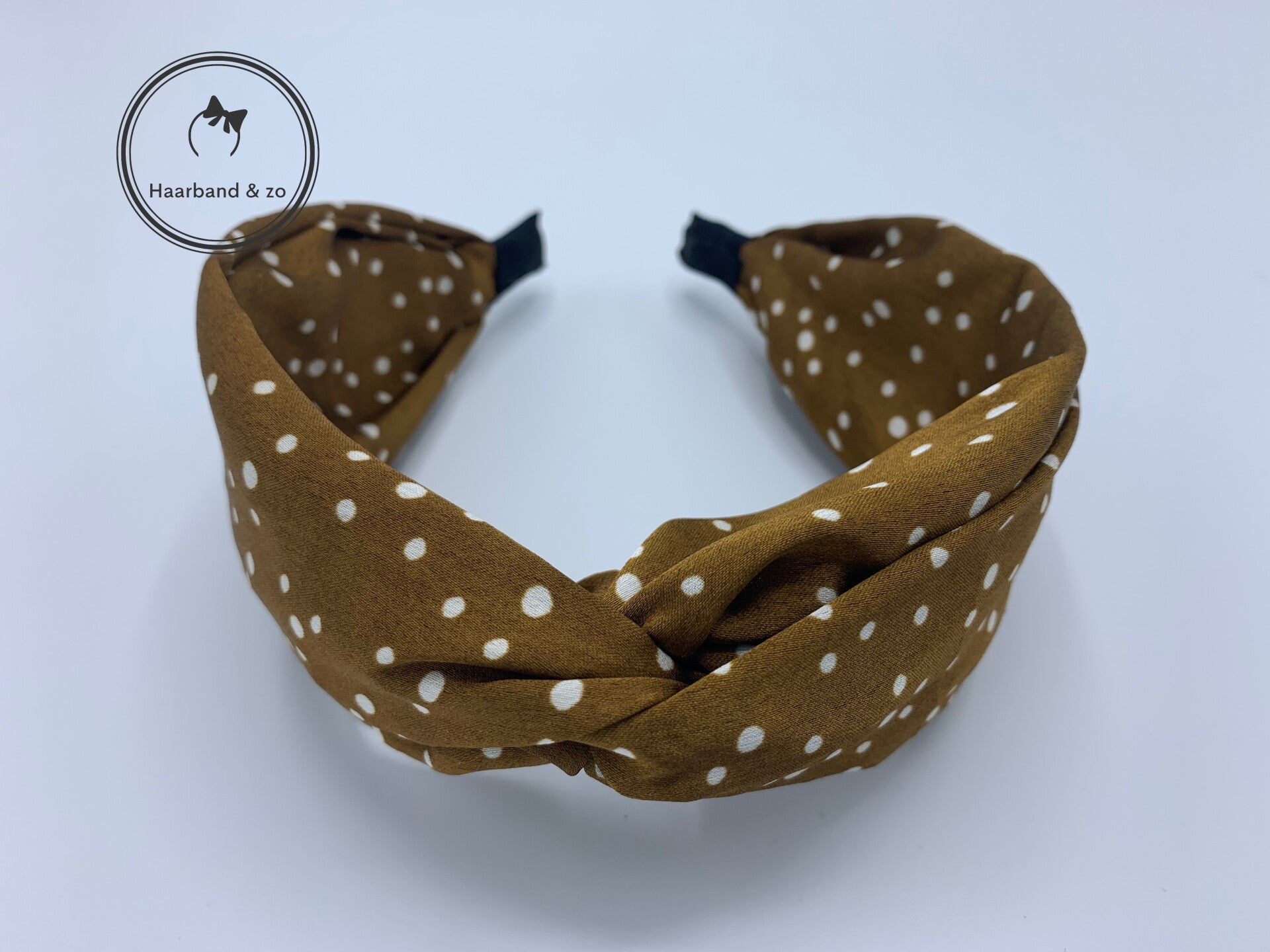 - Brede haarband met twist, gemaakt van iets glanzend satijn, in stippeltjes patroon, cider met witte stipjes.