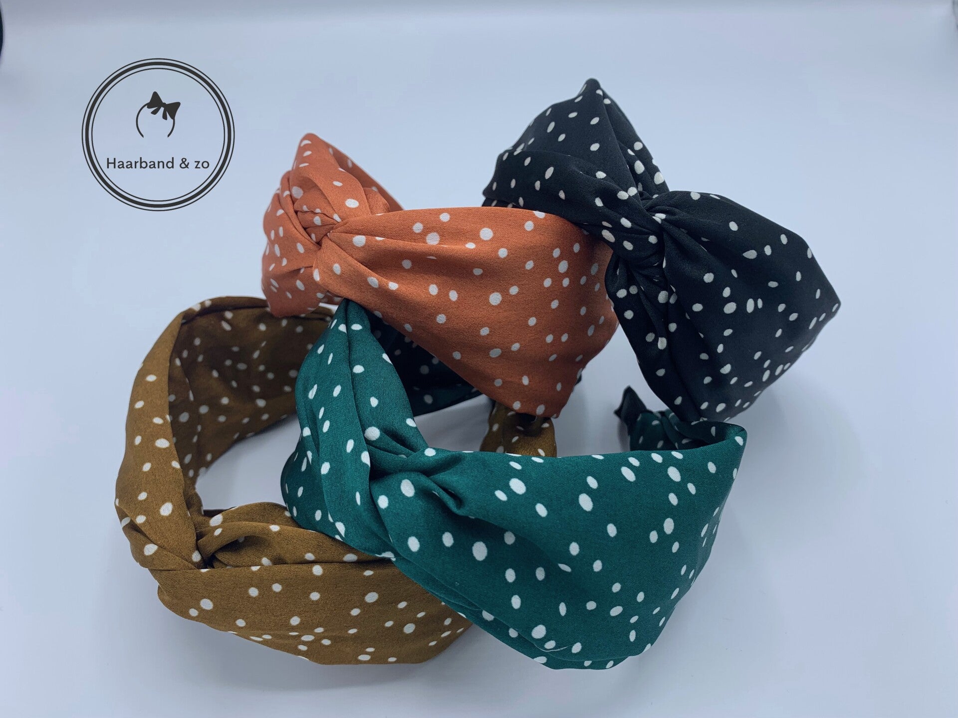 - Brede haarband met twist, gemaakt van iets glanzend satijn, in stippeltjes patroon, oranjebruin met witte stipjes.