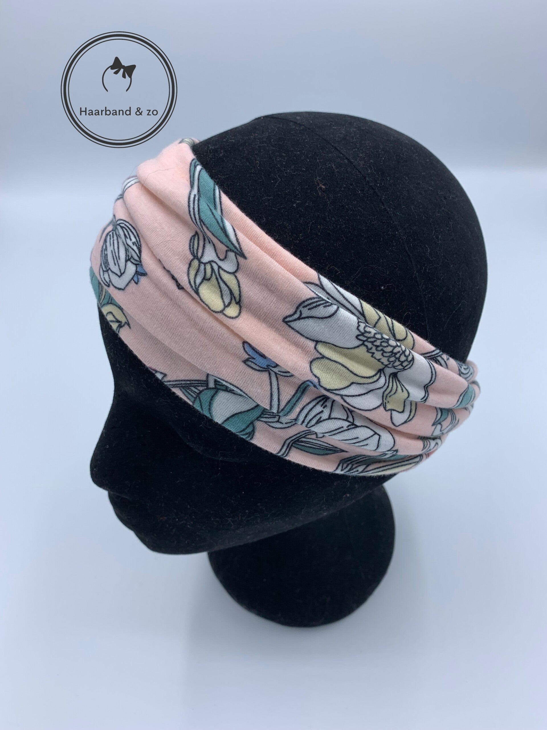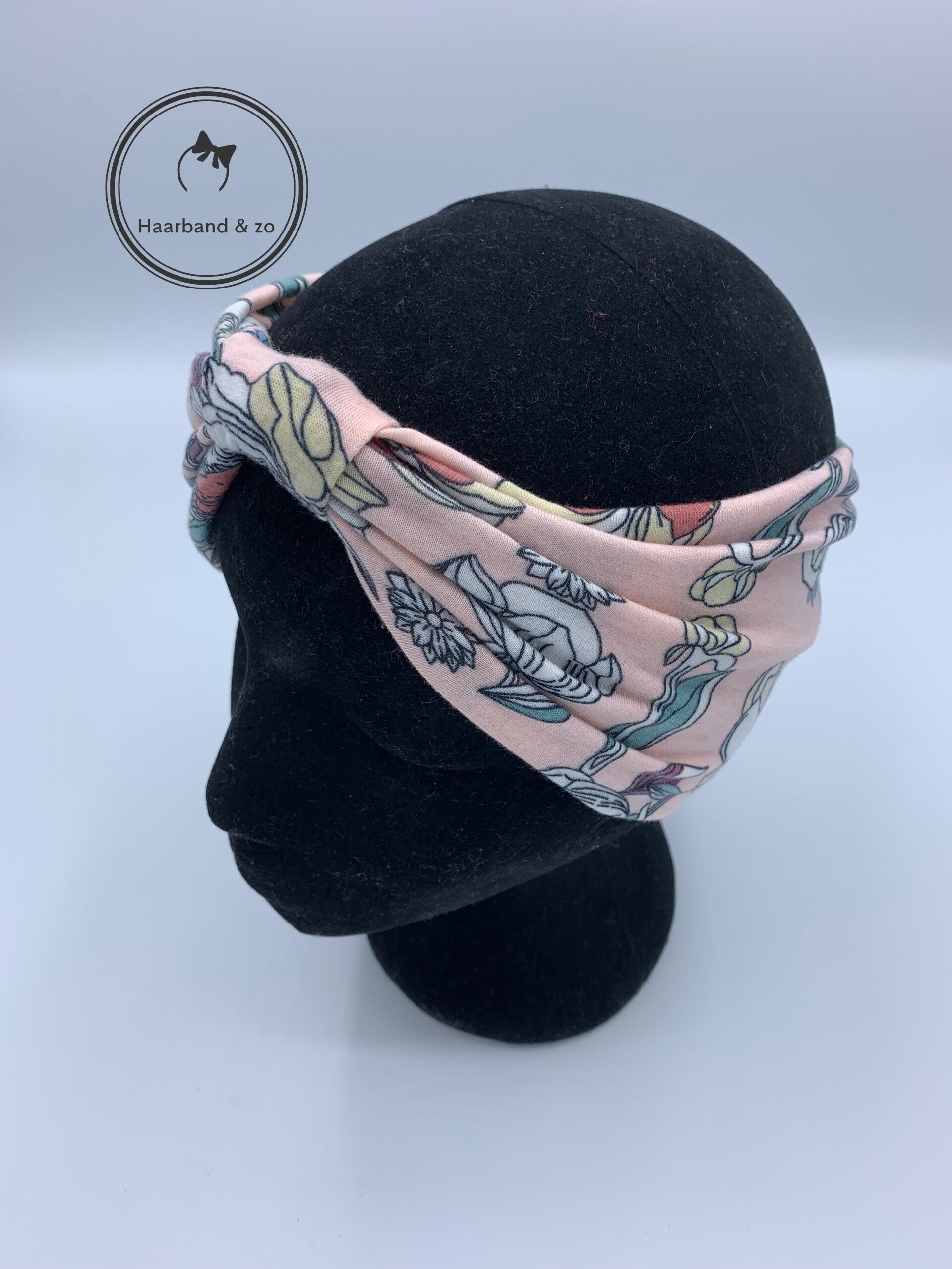 Extra brede elastische haarband in Poederroze met bloemenprint (art.nr. 242-04)