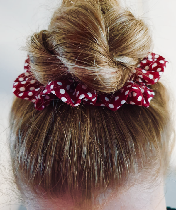 - Scrunchie (wokkel, frutsel), met stippenpatroon in de kleur donkerrood.