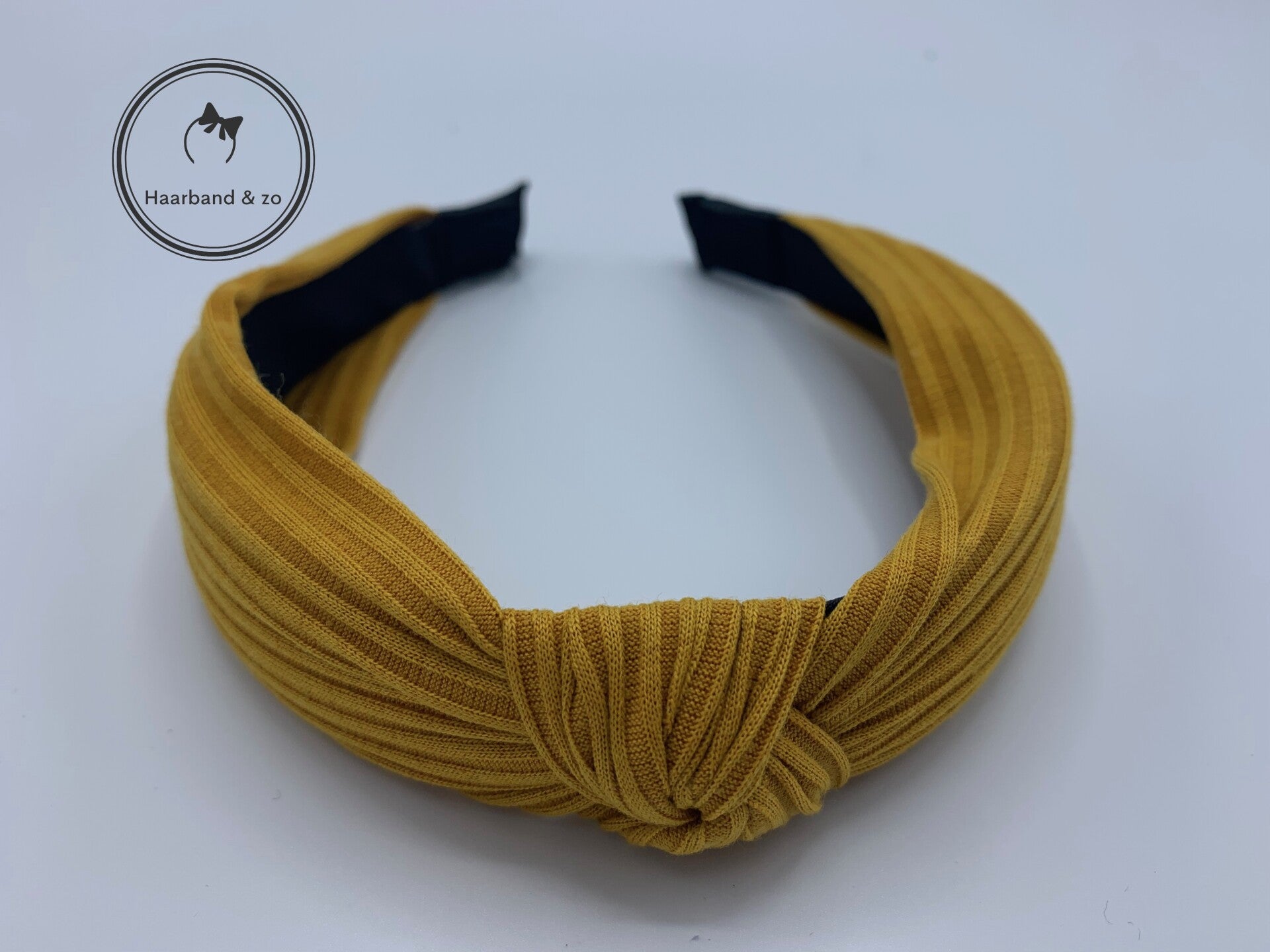 - Basic booghaarband in ribbeltricot, met knoop, in de kleur oker.