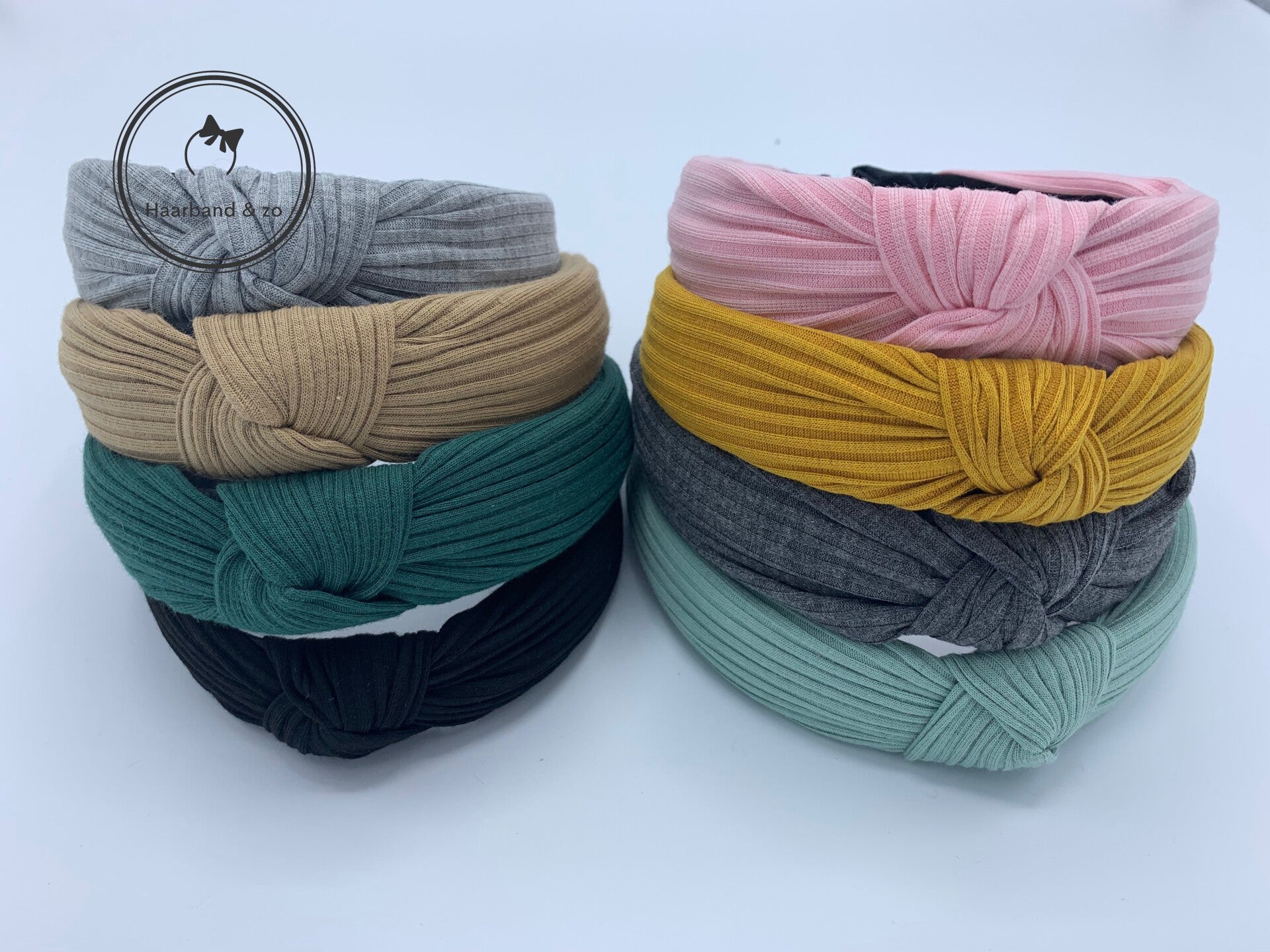 Basic booghaarband in ribbeltricot, met knoop, in de kleur oker (art.nr. 45-01)