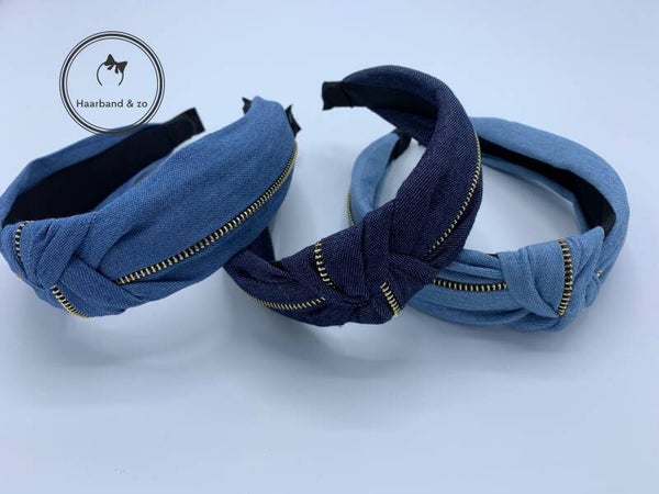 - Ook aan je jeansoutfit is gedacht met deze mooie brede booghaarband van jeansstof. De stof is afgezet met een ritseffect. Donkerblauw
