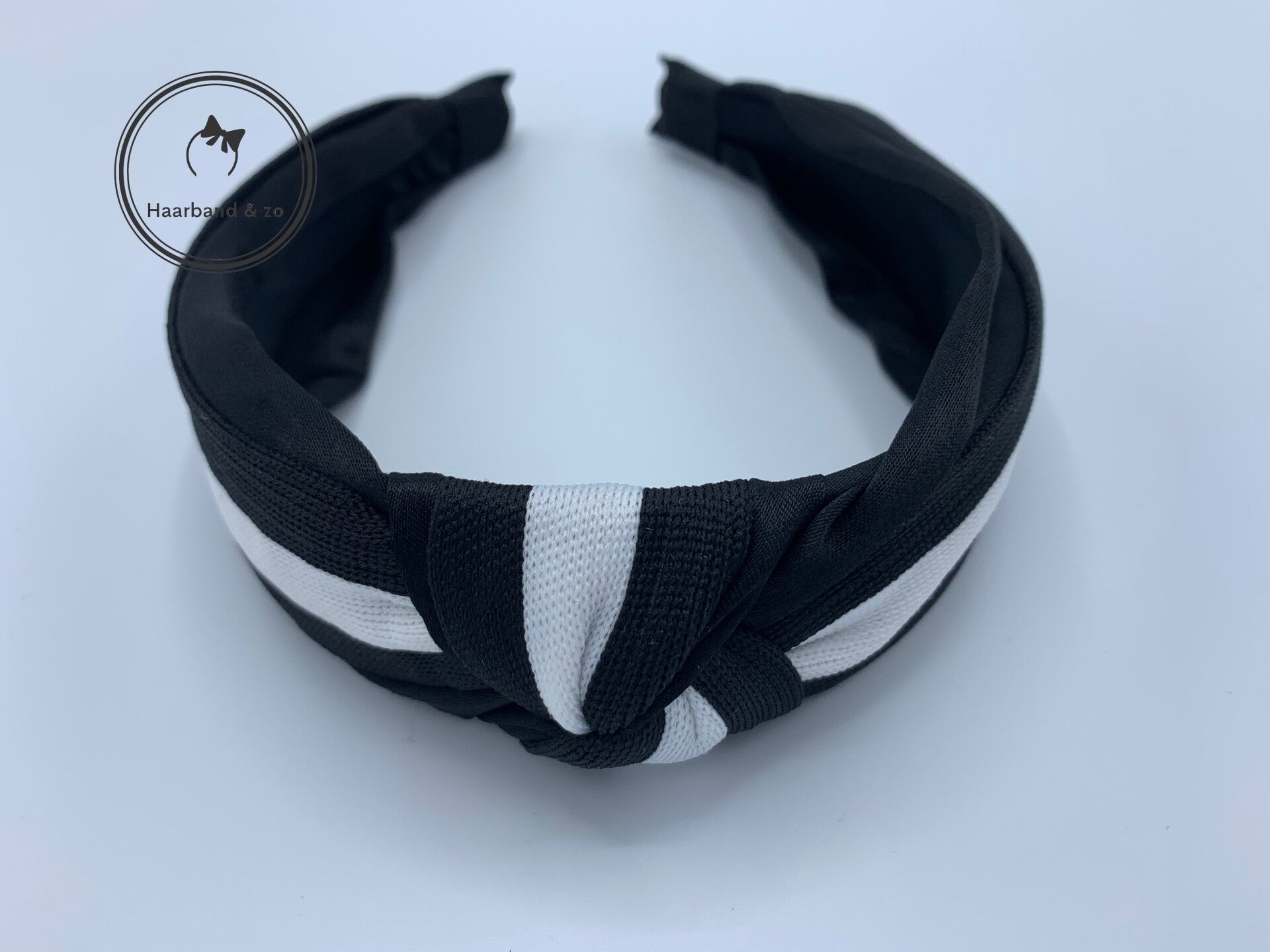 - Een absolute topper, deze mooie brede haarband met knoop, in zwart glanzend satijn met een zwart/wit gestreepte, gebreide band.