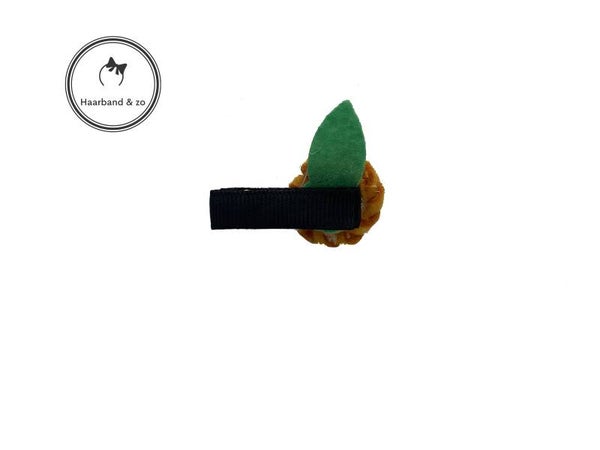 - Mini haarspeldje met okerkleurig bloempje en pareltje.