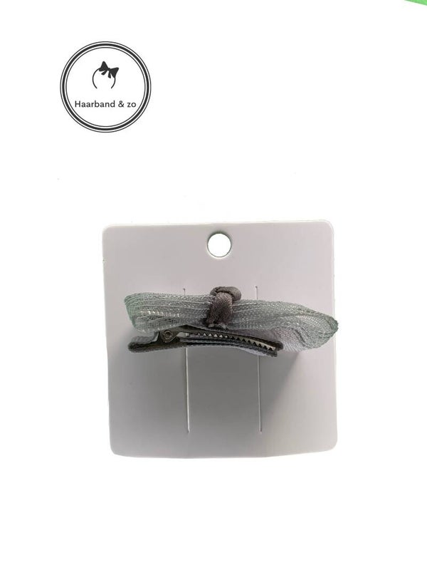 - Mini haarspeldje met grijs glanzend strikje.