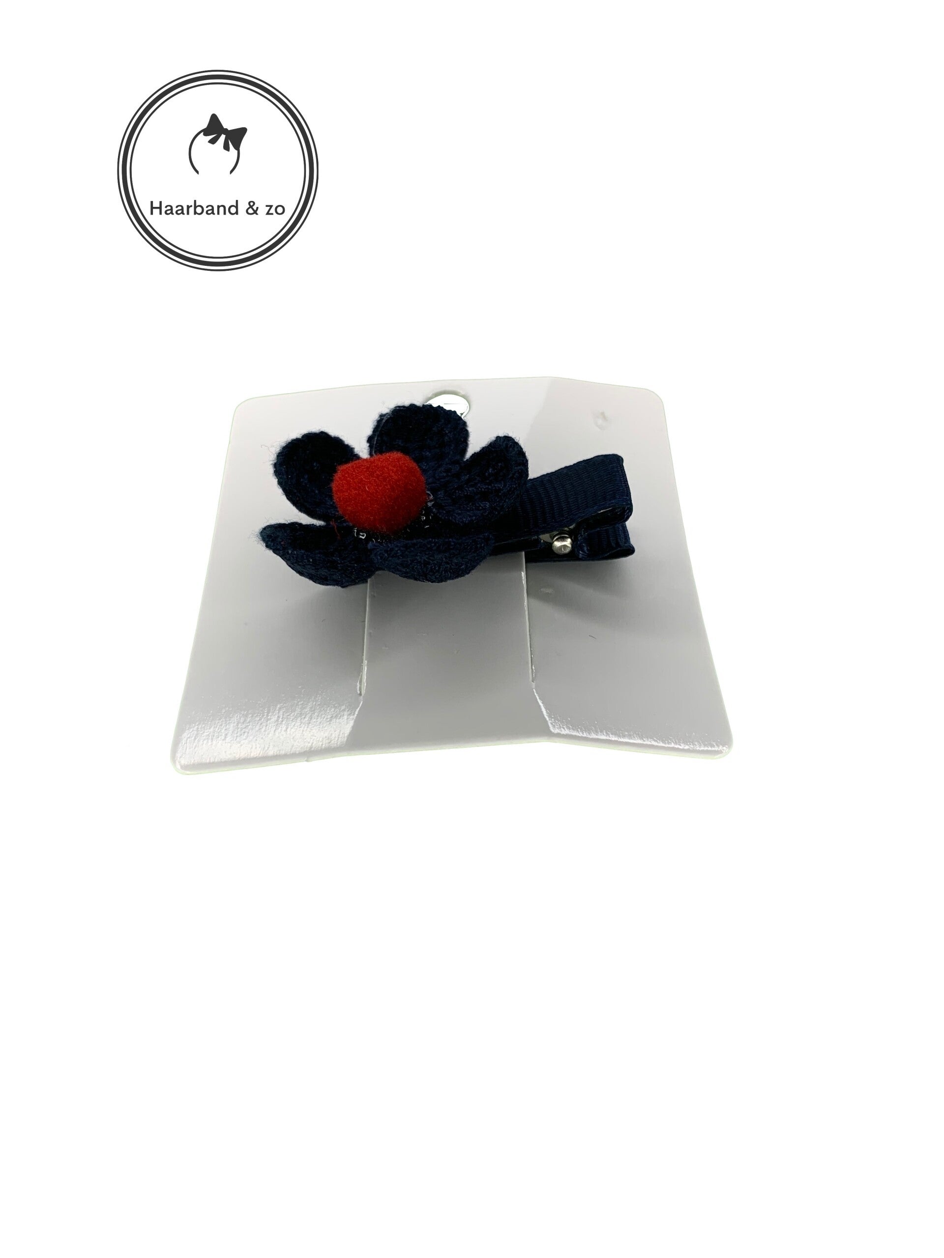 - Mini haarspeldje met blauw gehaakt bloemetje, rode pompom op blauw klemmetje.
