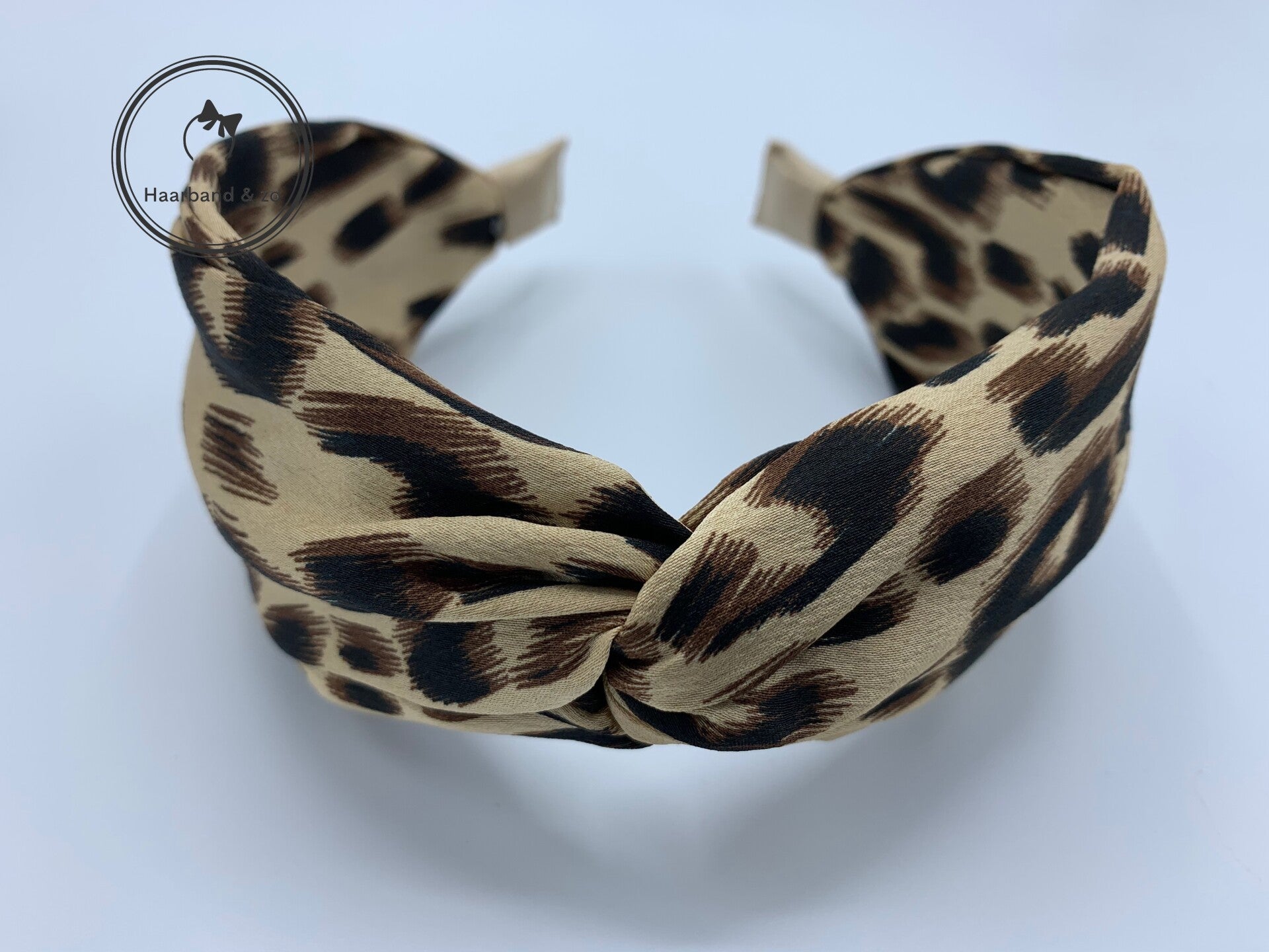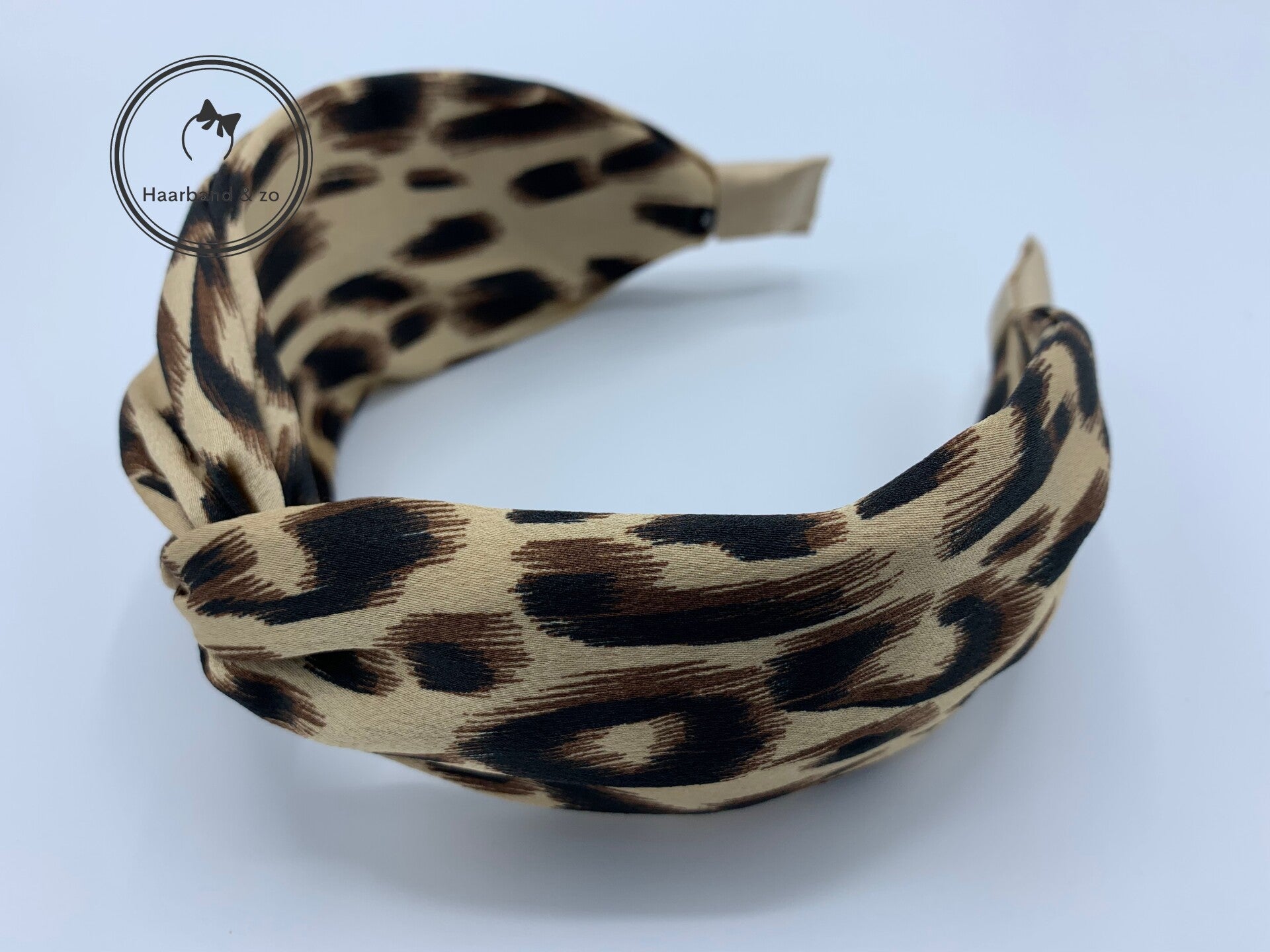 - Extra brede satijnen (boog)haarband met tijgerprint, in de kleur beige. Deze haarband heeft geen knoop bovenop maar een twist.
