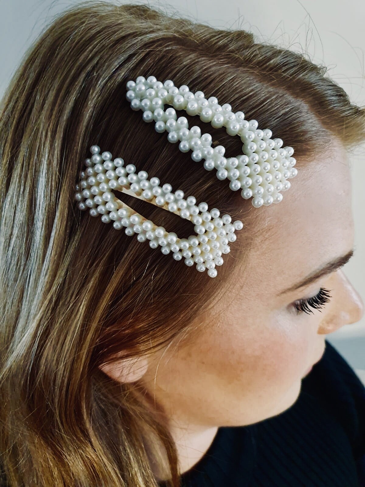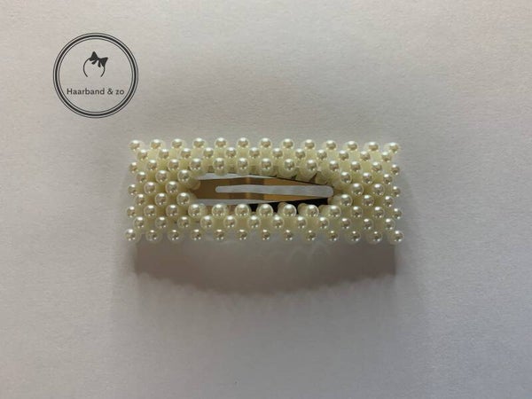 - Ook deze is onmisbaar bij je trendy outfit. Grote licht gebogen haarclip, rechthoek met pareltjes. Zilverkleurige clip.