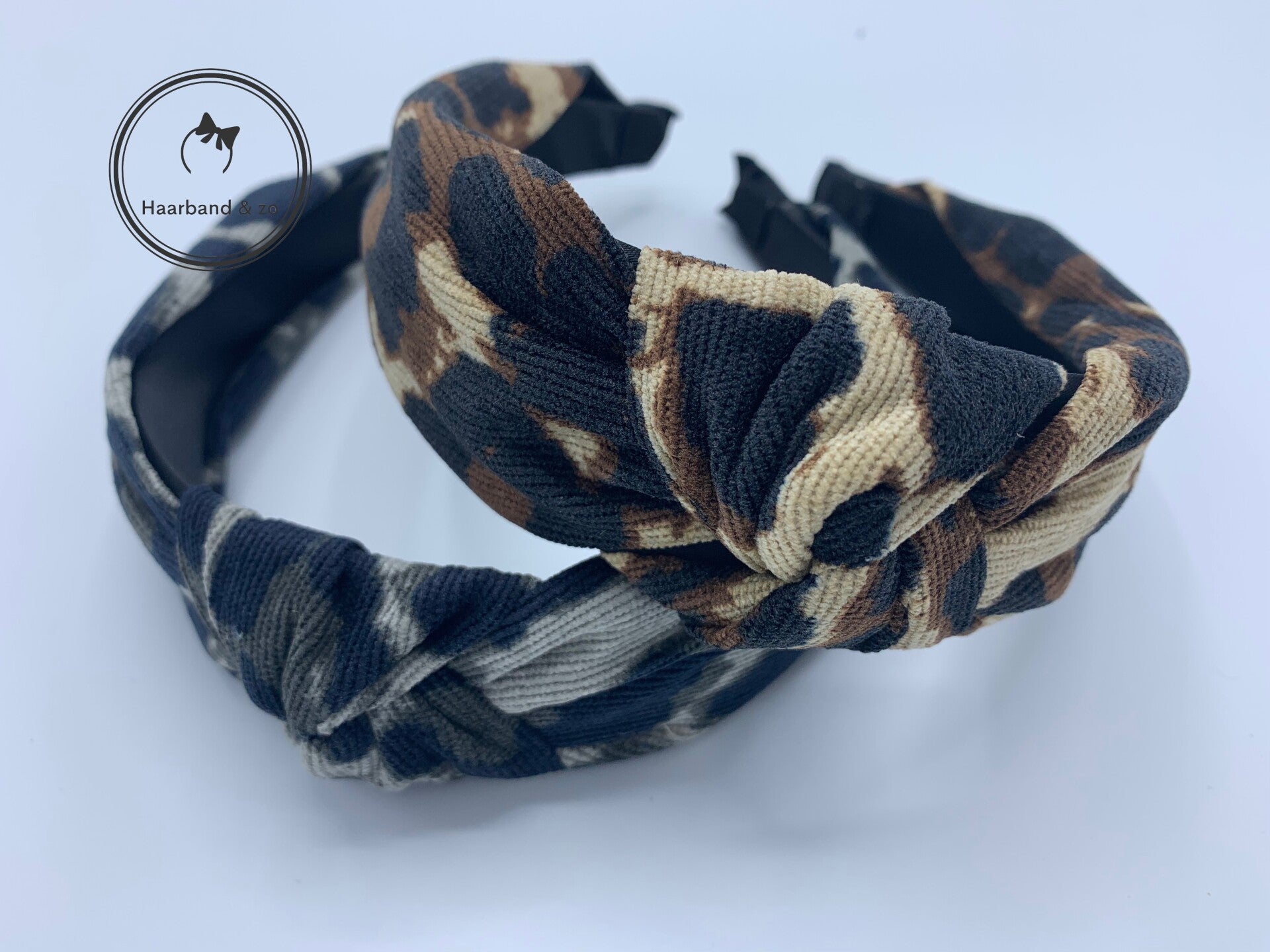 - Brede booghaarband met knoop, van fijn ribfluweel, met bruin/zwarte tijgerprint.