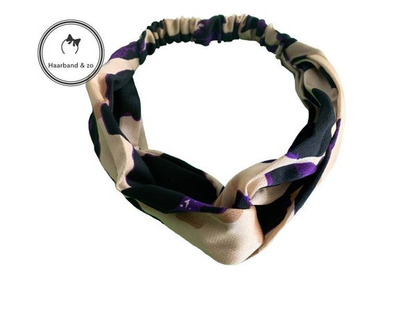 Elastische haarband met twist, satijn, in tijgerprint met paars accent (art.nr.121-01)