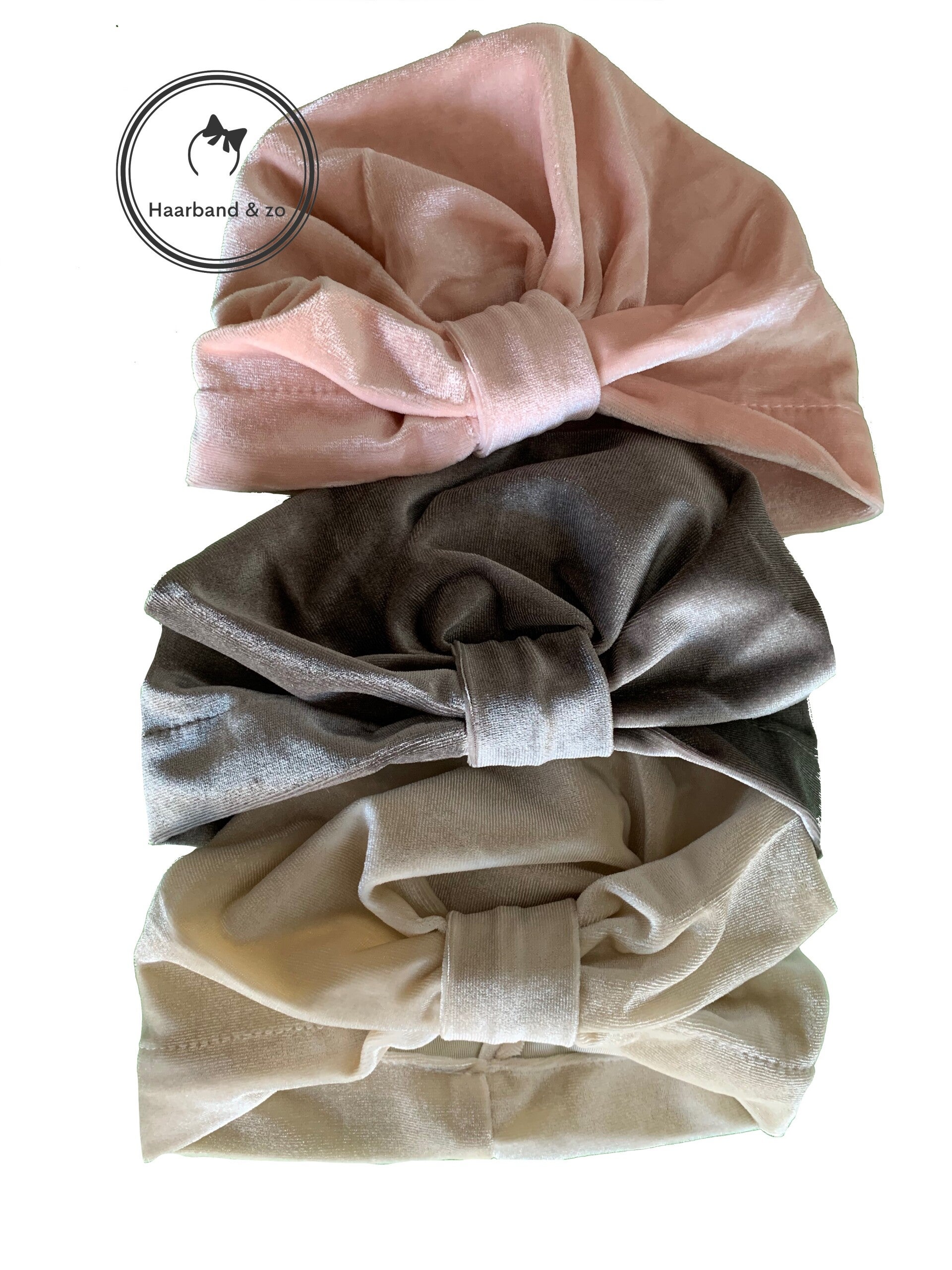 - Helemaal hip en trendy dit schattige babymutsje (tulband) met grote knoop, grijs fluweel.