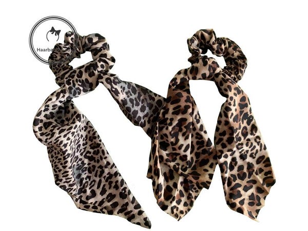 - Prachtige sjaal scrunchie (wokkel / frutsel) waar een sjaaltje aan vast is geknoopt, tijgerprint in grijze kleuren.