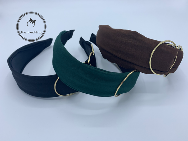 - Feestje of gewoon casual chique, deze prachtige haarband maakt je outfit compleet. Deze booghaarband heeft geen knoop (dus minder volumineus), maar een detail met goudkleurige ringen waar de stof doorheen gevlochten zit.