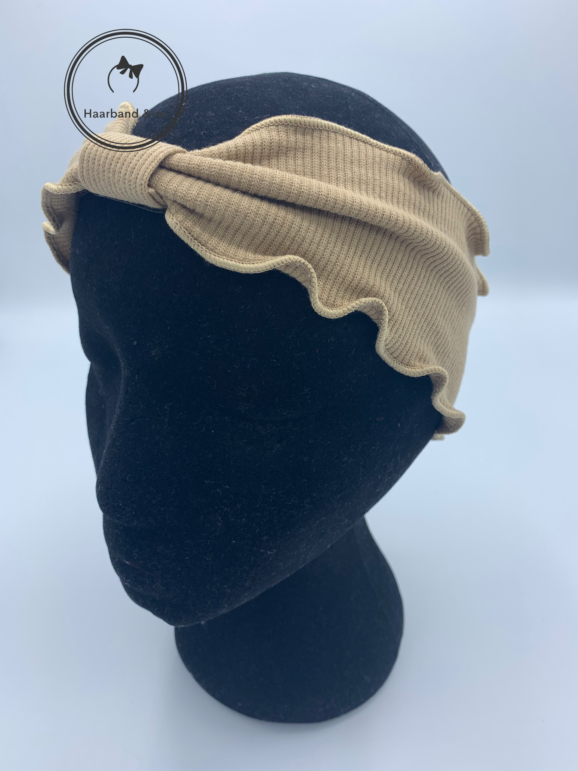 Elastische haarband van ribbelstof, geschulpte rand met knoop, beige (art.nr. 257-01)